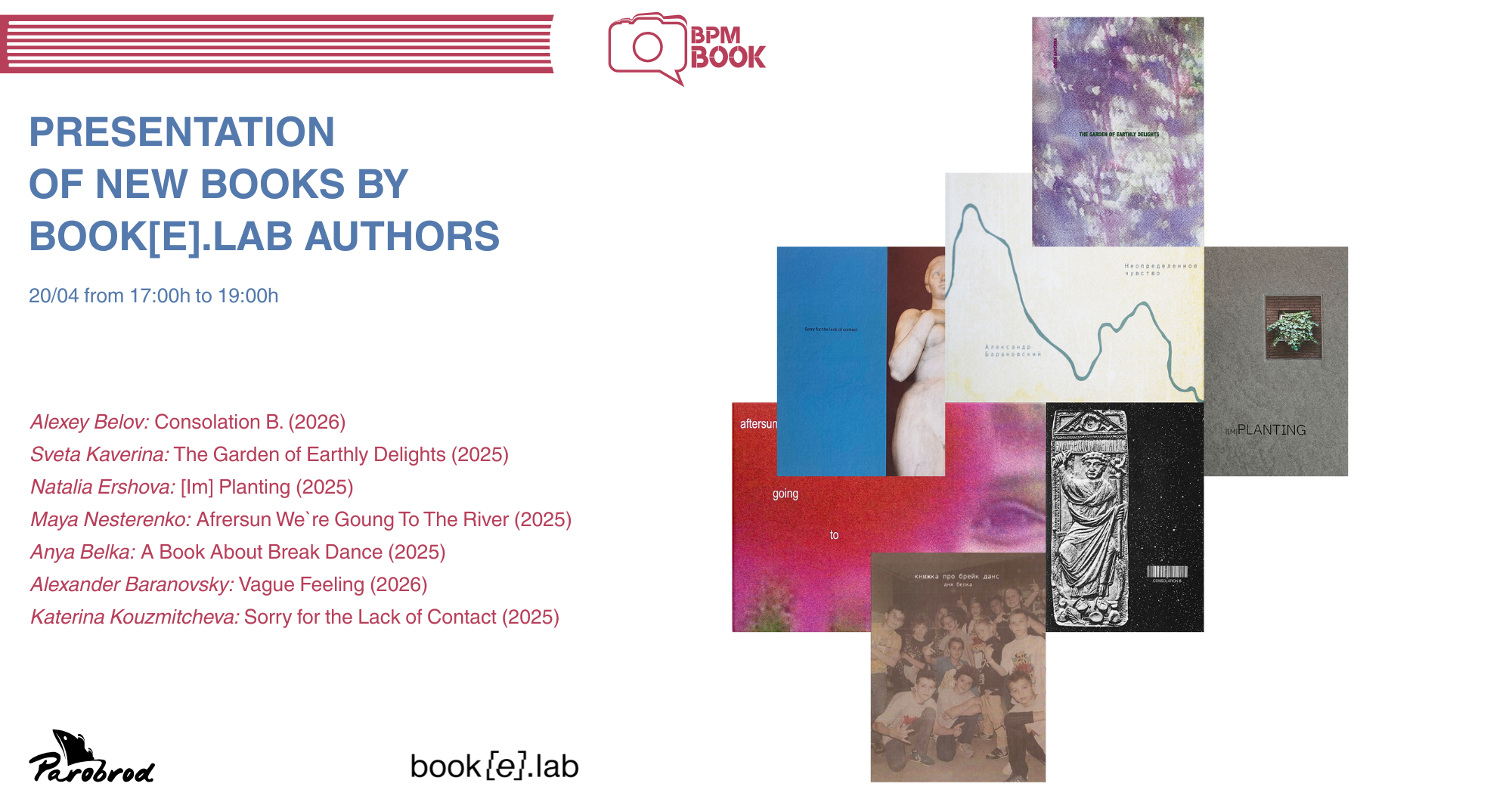 Ovaj događaj predstavlja nove knjige autora objavljene pod kustoskim vođstvom nezavisne izdavačke platforme Book[e]lab, koju su 2020. godine osnovale Olga Matveeva i Jenya Yahina. Radeći na preseku savremene umetnosti i dizajna foto knjige, Book[e]lab se fokusira na umetničke knjige u ograničenim tiražima u kojima su vizuelni narativ i materijalna forma osmišljeni kao jedinstvena umetnička celina.
