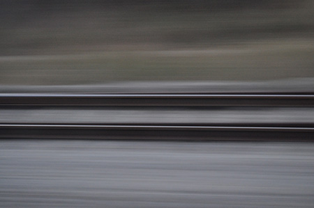 (Slovenija). Odabrani prizor na fotografijama je isti, krupni kadar paralelnog železničkog koloseka, viđenog kroz prozor voza u pokretu.Izbor voza za prevozno sredstvo po bivšim jugoslovenskim državama svakako nije najbrži način da se stigne iz tačke A u tačku B, međutim takvo putovanje putniku daruje nešto dragoceno – vreme, kojeg je sve manje u savremenom svetu. Dobijeni period dokolice omogućava drugačiju, nenaviknutu i dublju percepciju vremena i prostora, kako spoljašnjeg